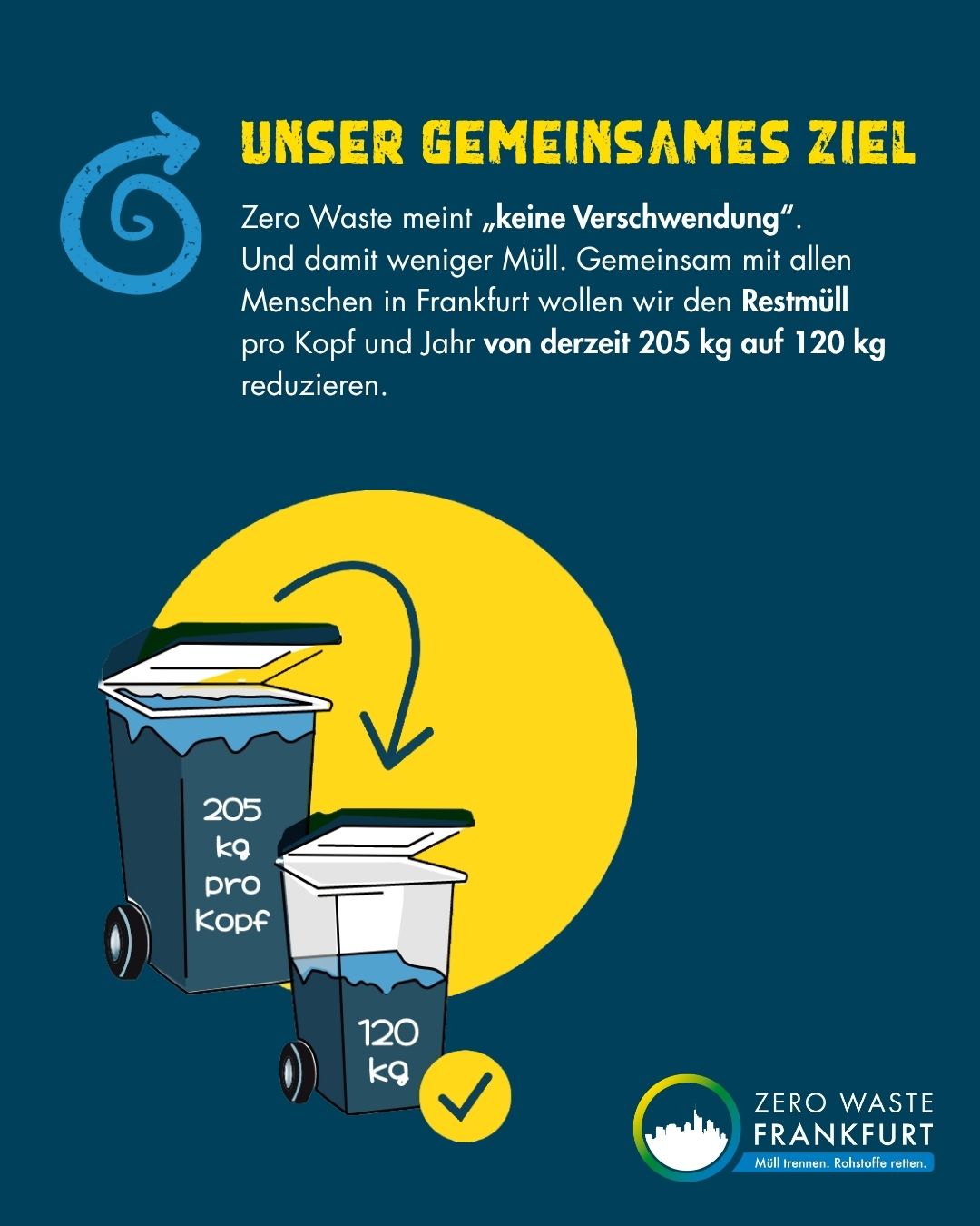 Zero Waste bedeutet nicht „gar kein Abfall mehr“, sondern: keine Verschwendung. Gemeinsam wollen wir den Restmüll pro Kopf von aktuell 205 kg auf 120 kg pro Jahr reduzieren.